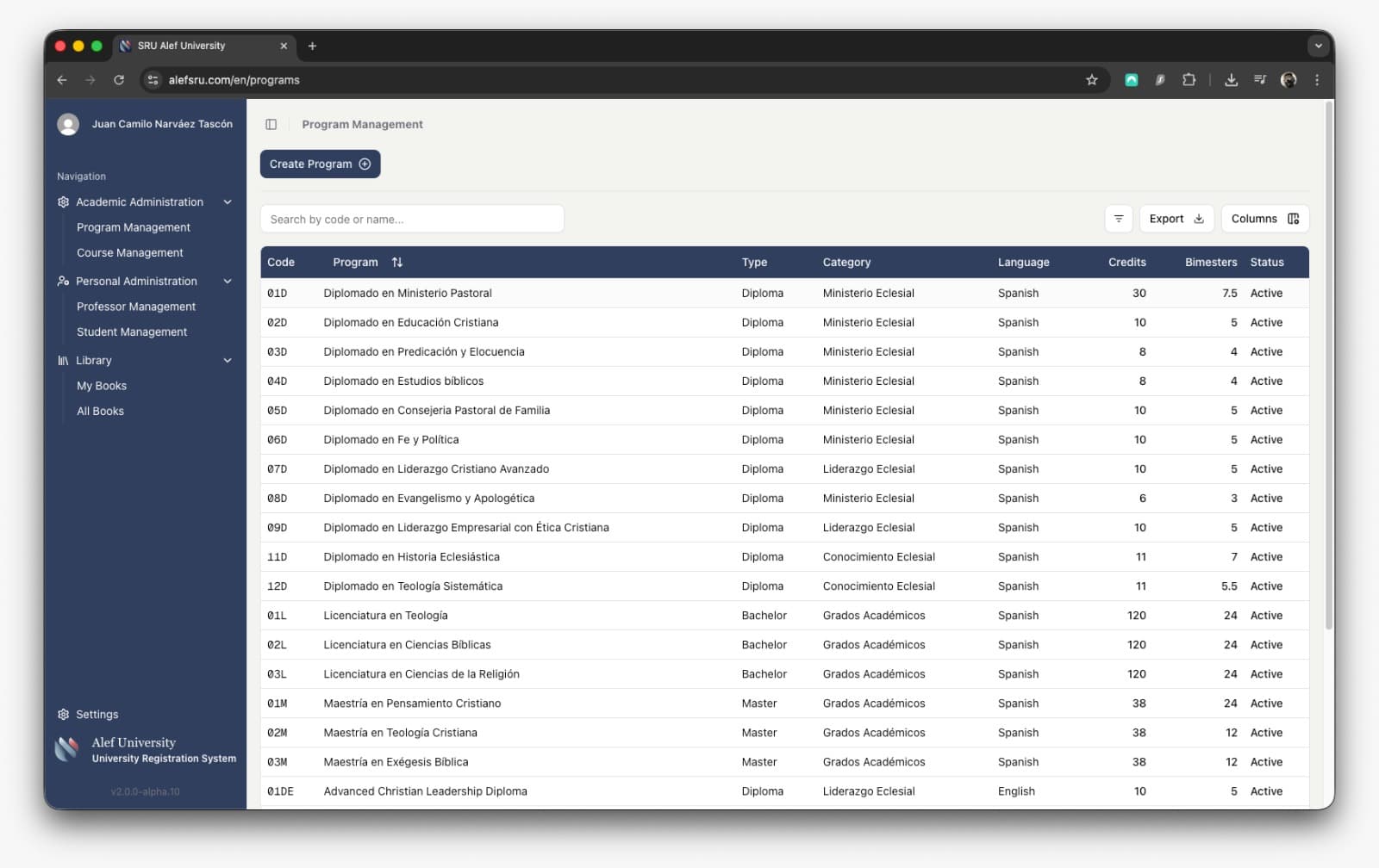 Alef University needed more than a polished dashboard. The product had to coordinate the daily realities of an academic institution: student records, program structures, course catalogs, grading, enrollment, documentation, and an expanding digital library, all while serving students, professors, and administrators from the same codebase.
